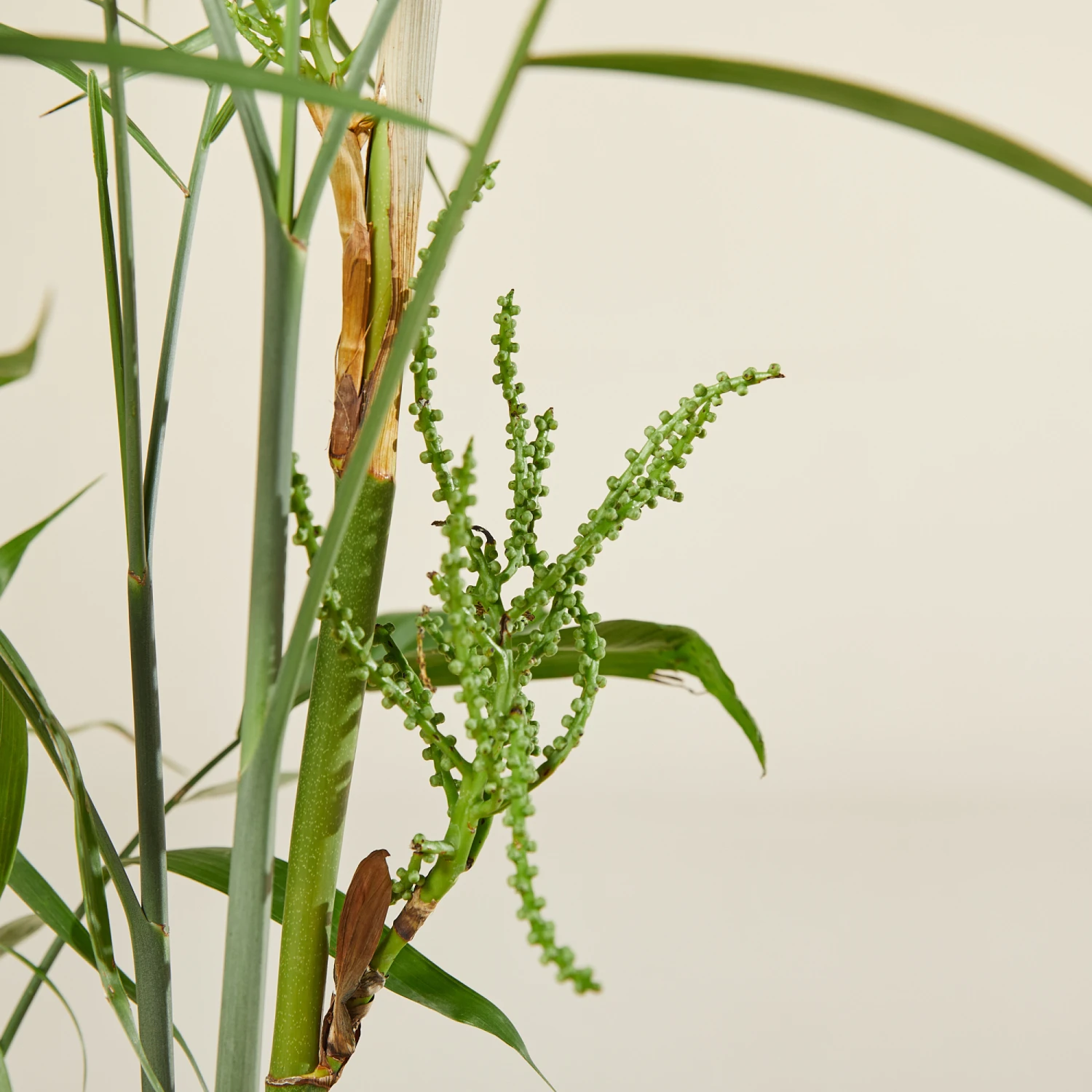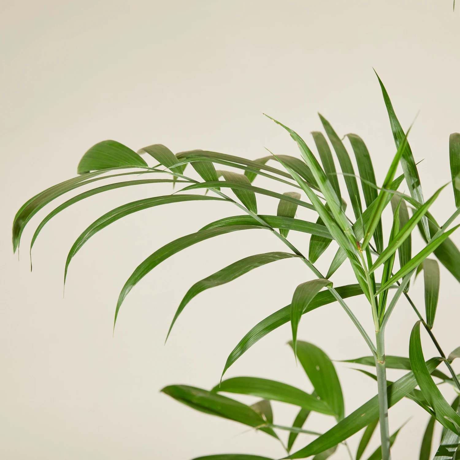 Closely related to the much more common Parlour Palm, this Chamaedorea has tall canes topped with a small crown of deep green leaves. As the plant ages it produces many suckers so over time the plant resembles a clump of bamboo.