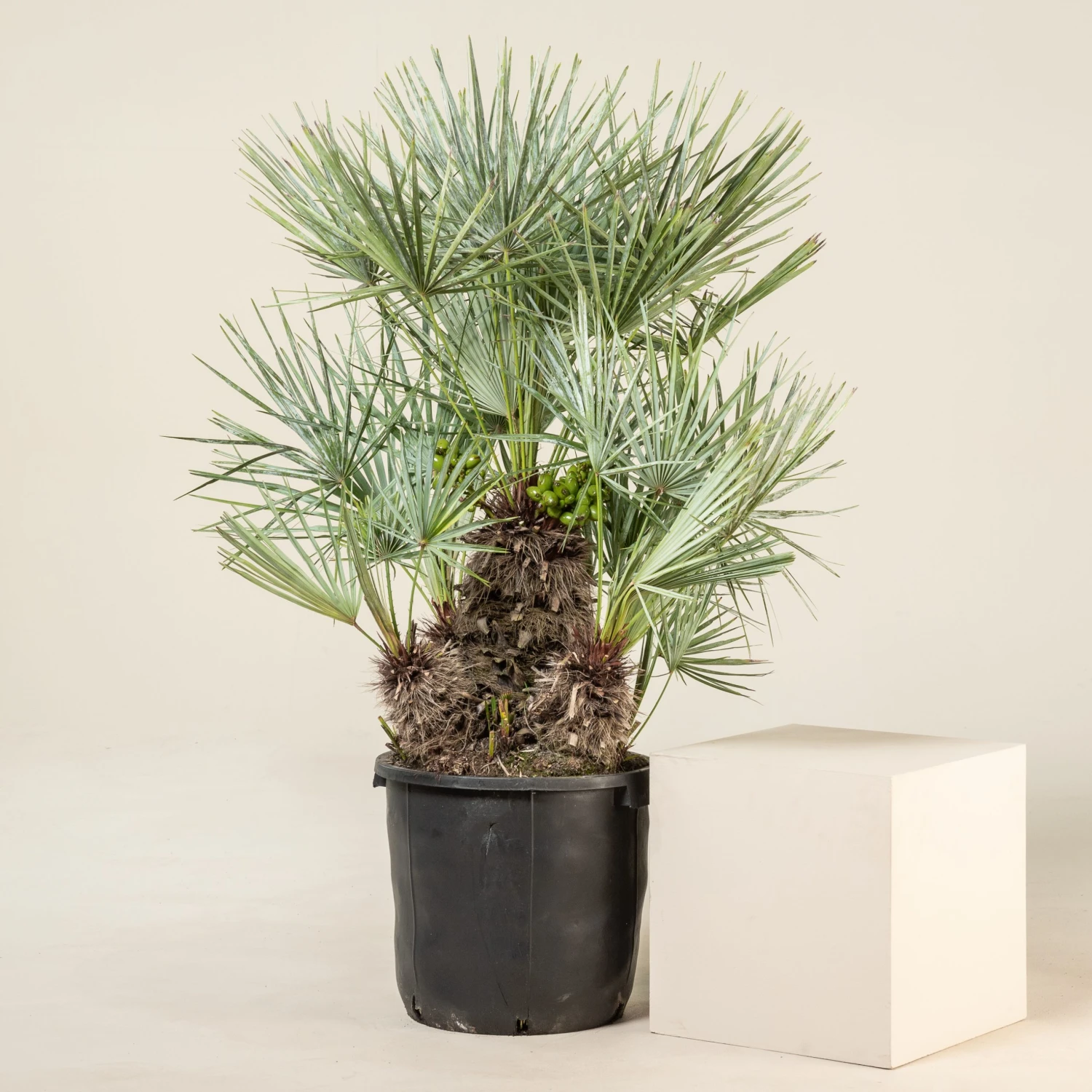 A breathtaking silver-blue form of the classic palm, Chamaerops humilis var. cerifera is aesthetically a perfect companion for other hardy arids such as yucca and dasylirion, or along side olives and other Mediterranean classics in a sunny border.
