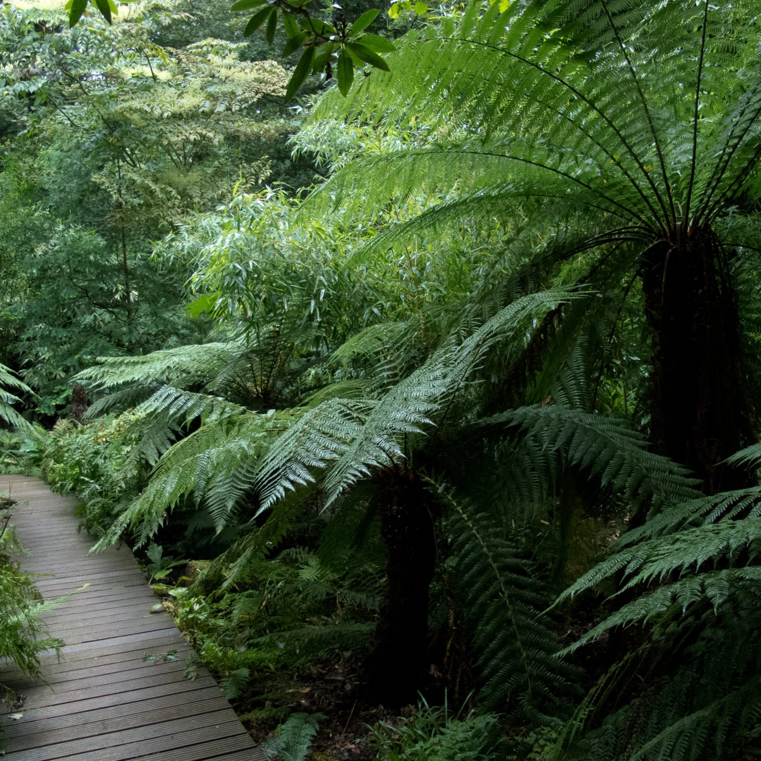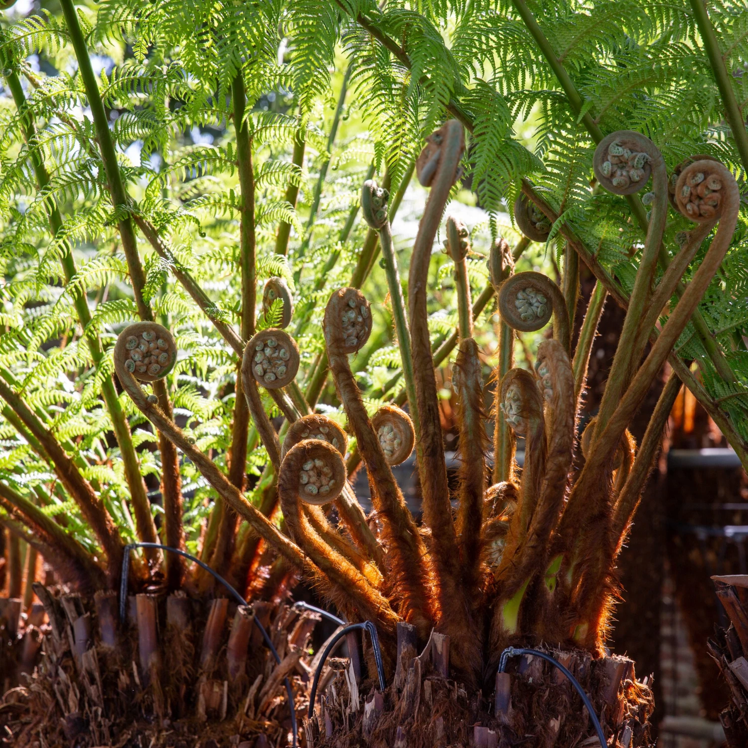 The easiest tree fern to cultivate in the UK, Dicksonia antarctica has a spectacular crown of huge, finely dissected foliage on magnificent broad fibrous trunks.