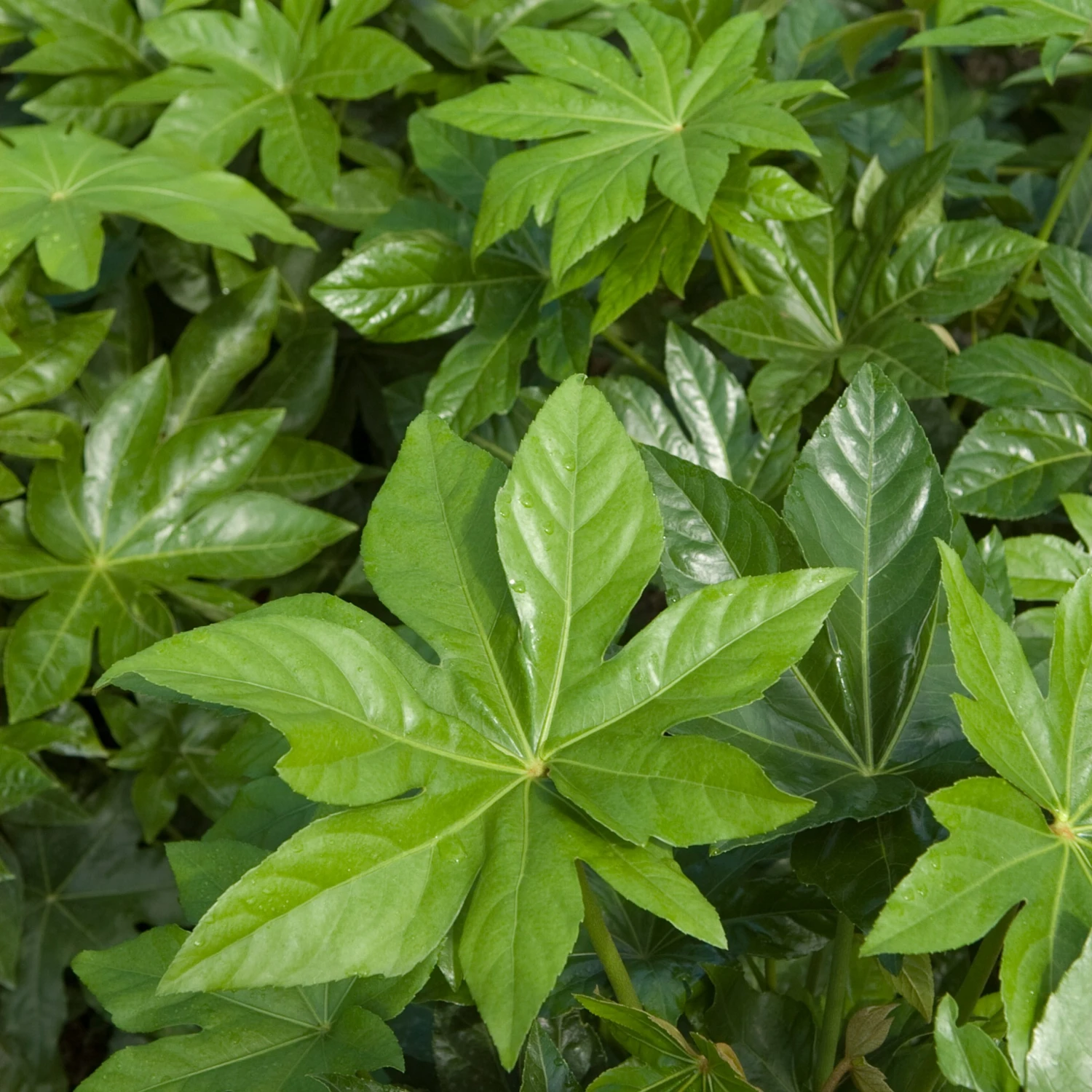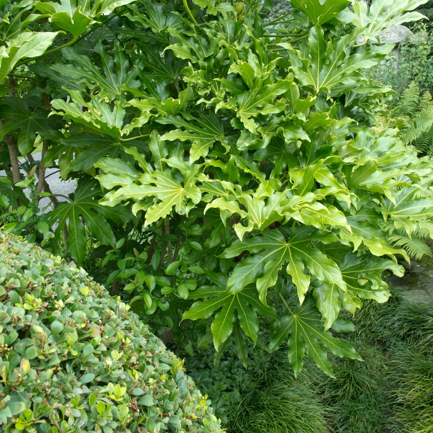 Fatsia japonica features iconic lobed leaves, and produces pleasing white flowers and black berries in autumn.