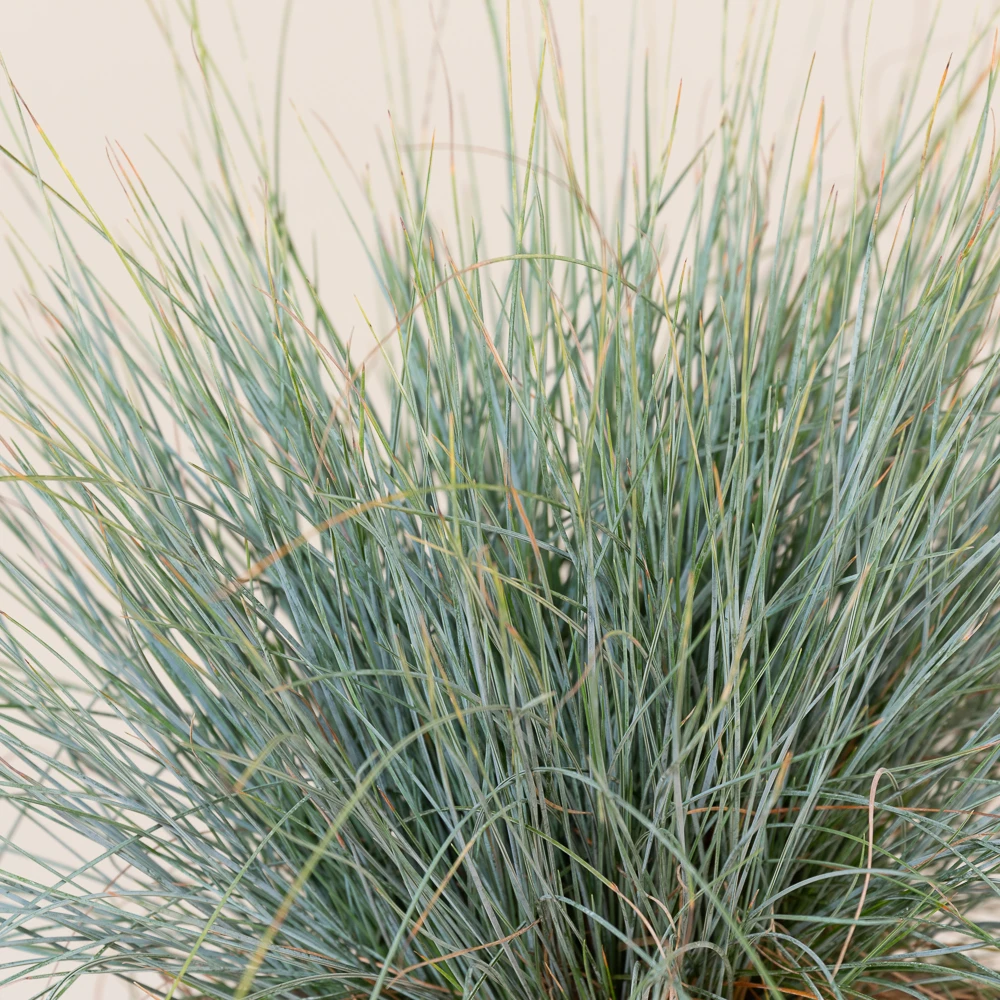 Blue Fescue is a low-growing, semi-evergreen clump-forming ornamental grass famed for its glaucous blue-grey foliage. Light green flowers tinged with purple appear in late spring, which give way to seed heads which some gardeners also find attractive.