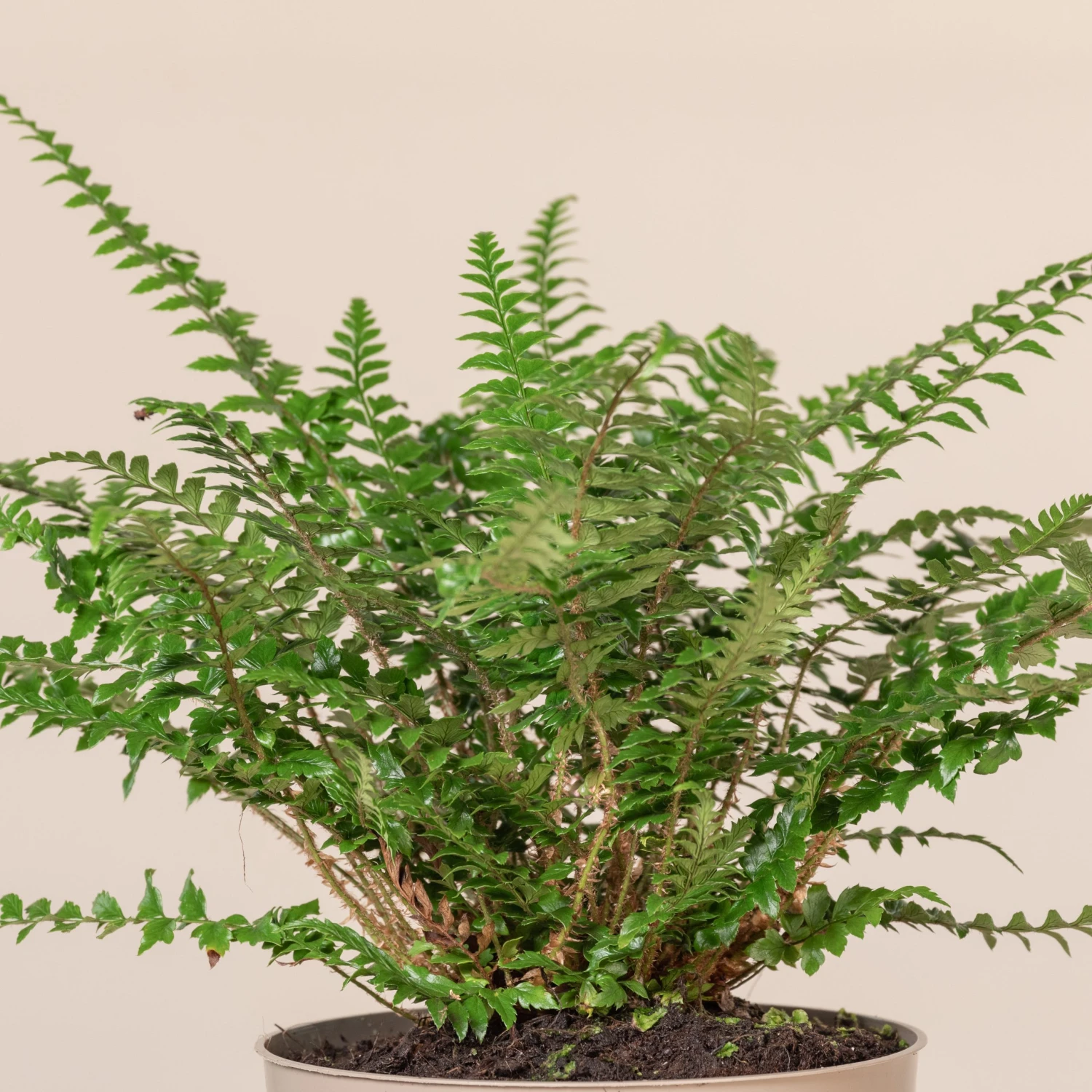 The Asian Sabre Fern is a tough and striking evergreen fern with dark lustrous foliage and midribs ornamented by coppery fur.