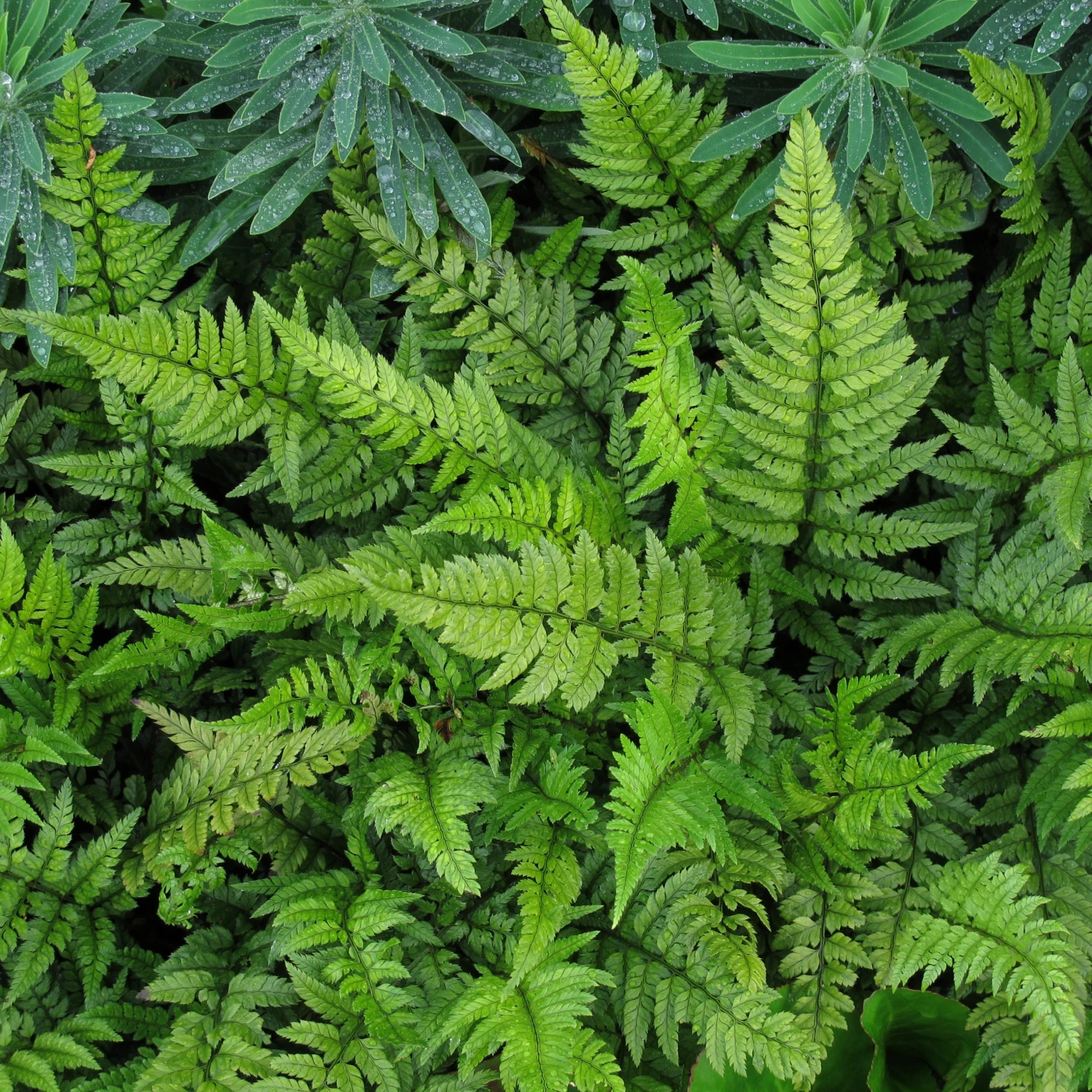 Polystichum tsus-simense exhibits glossy green leaves with a hint of steely blue that create pleasing contrast with its black scales and leaf bases.